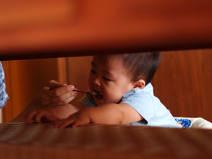 テーブルの下で窮屈そうに離乳食を食べる空。